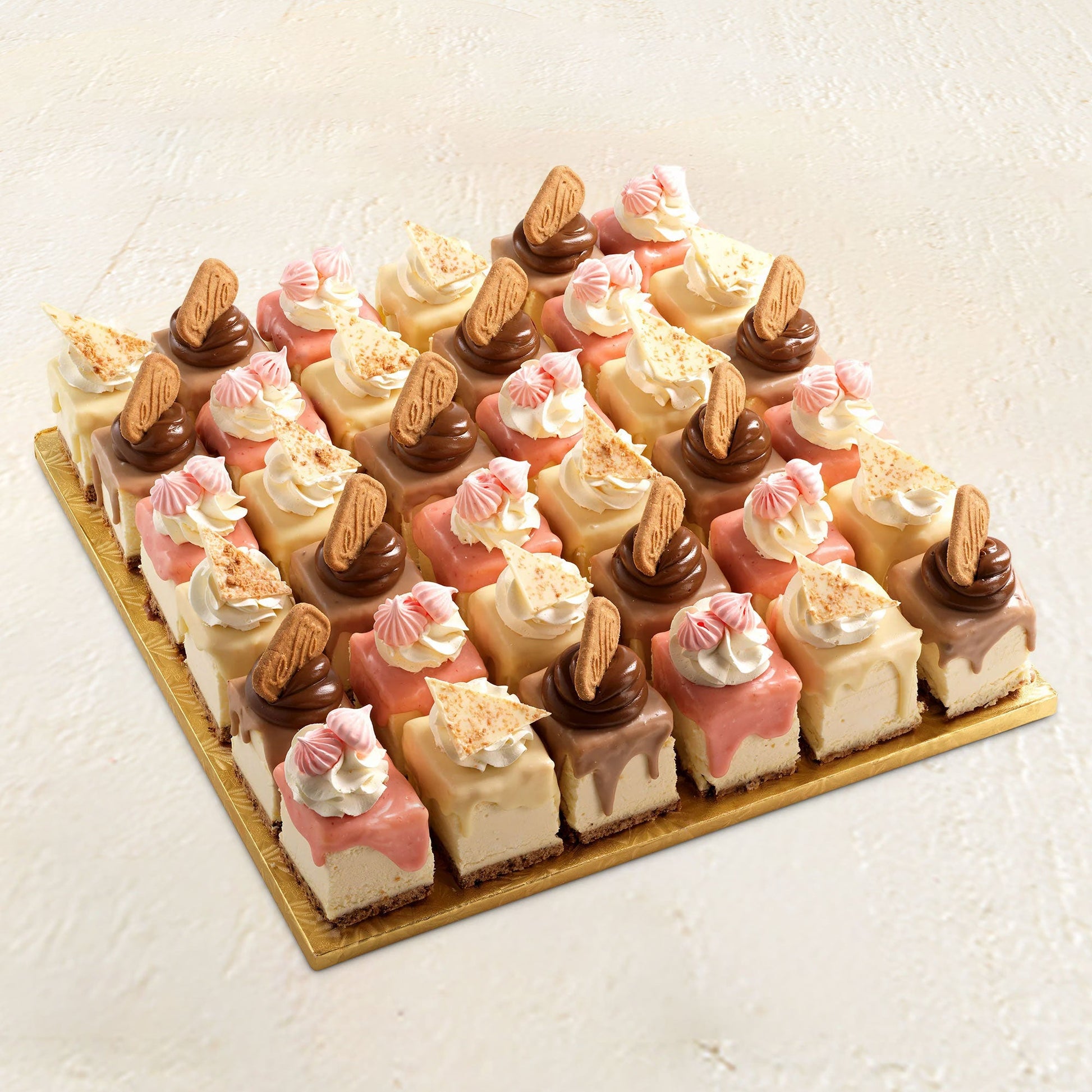 14"x14" Vanilla flavored cheesecake precut and individually decorated with strawberry, dulce de leche, and white chocolate flavor toppings.
