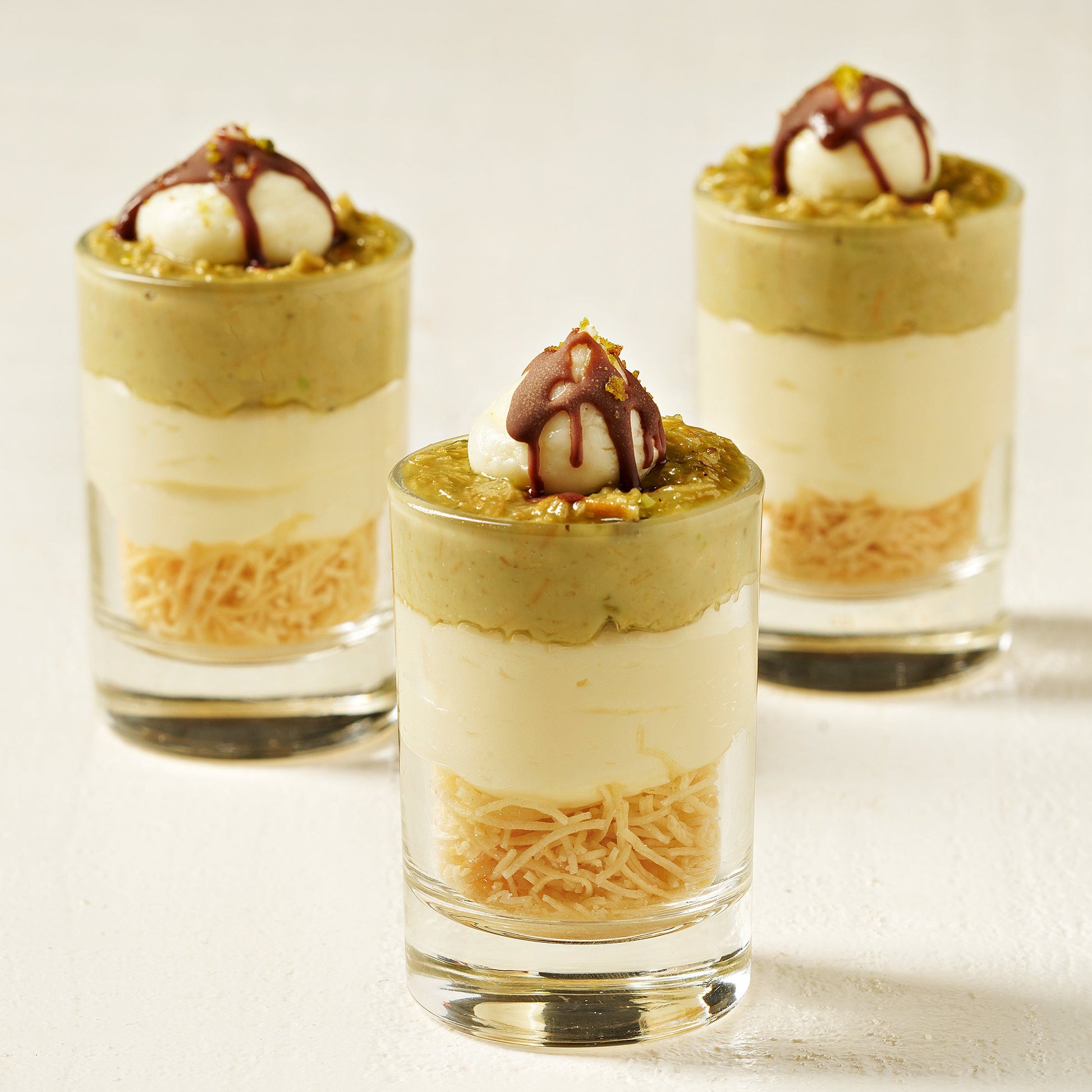 Roasted katayfi, cream cheese, and crispy Dubai mixture with chocolate drizzle layered in a shot cup.