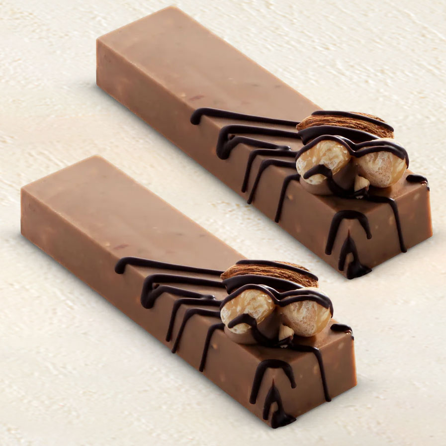 Chocolate nut flavored log, decorated with nuts and a dark chocolate drizzle.